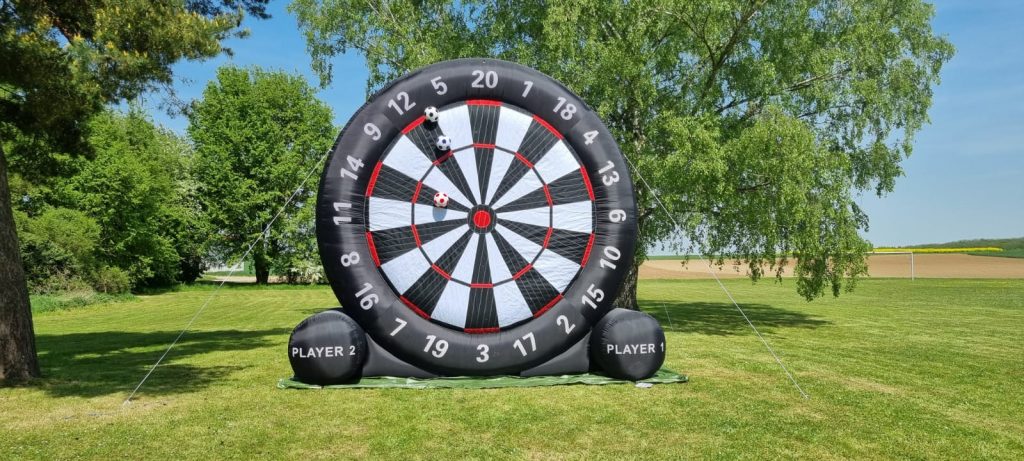 Unsere XXL-Dartscheibe ist ein Hingucker für ihre Veranstaltung. Sie ist einer echten Dartscheibe nachempfunden, jedoch wird nicht mit Pfeilen geworfen, sondern mit Klettbällen geschossen. Das Ziel besteht darin, möglichst viele Punkte zu erzielen. Durch die Klett-Technik bleiben die Bälle an der Scheibe haften und die Punkte können dann zusammengezählt werden.